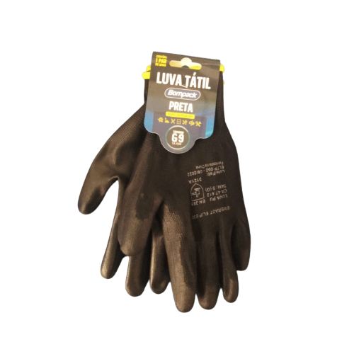 A Luva Tátil Bompack é uma luvade segurança, tricotada com fios de poliamida, sem costura, revestida na palma, face palmar e pontas dos dedos com poliuretano, punho com elastano, formato anatômico. É reutilizável.